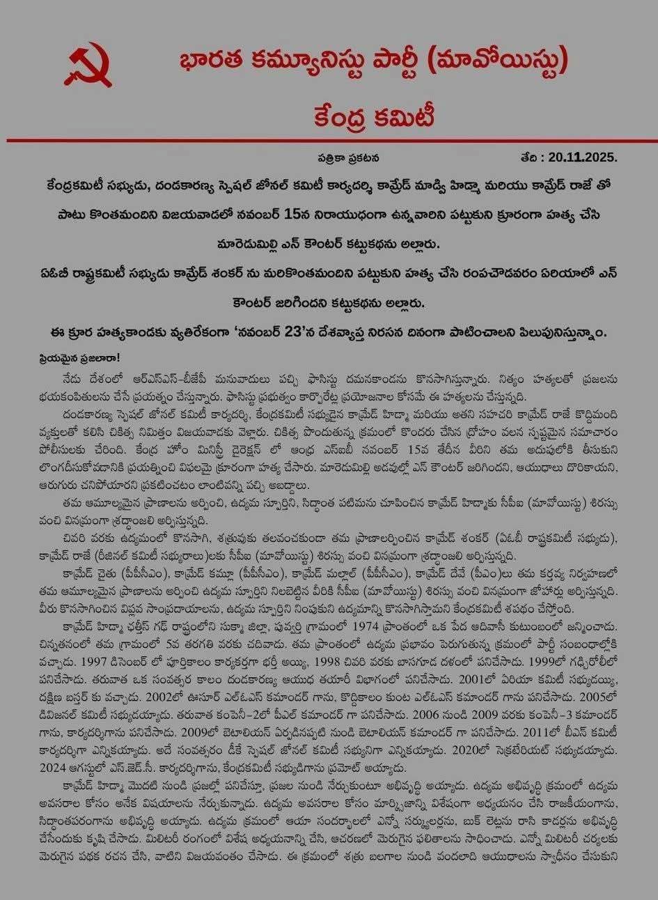 प्रेस विज्ञप्ति जारी करते हुए सीपीआई माओवादी के प्रवक्ता अभय ने कहा कि केंद्रीय समिति के सदस्य और दंडकारण्य विशेष क्षेत्रीय समिति के सचिव कामरेड माडवी हिडमा ने कामरेड राजे और कुछ अन्य लोगों के साथ मिलकर 15 नवंबर को विजयवाड़ा में निहत्थे लोगों को पकड़ लिया, उनकी निर्मम हत्या कर दी और मुठभेड़ की झूठी कहानी गढ़ी.