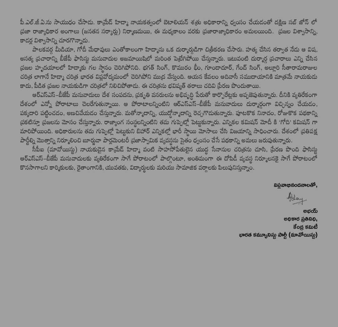 सीपीआई (माओवादी) कॉमरेड हिडमा को विनम्रतापूर्वक श्रद्धांजलि अर्पित करती है, जिन्होंने अपने बहुमूल्य जीवन का बलिदान दिया, आंदोलन की भावना और अपनी विचारधारा की ताकत का प्रदर्शन किया.