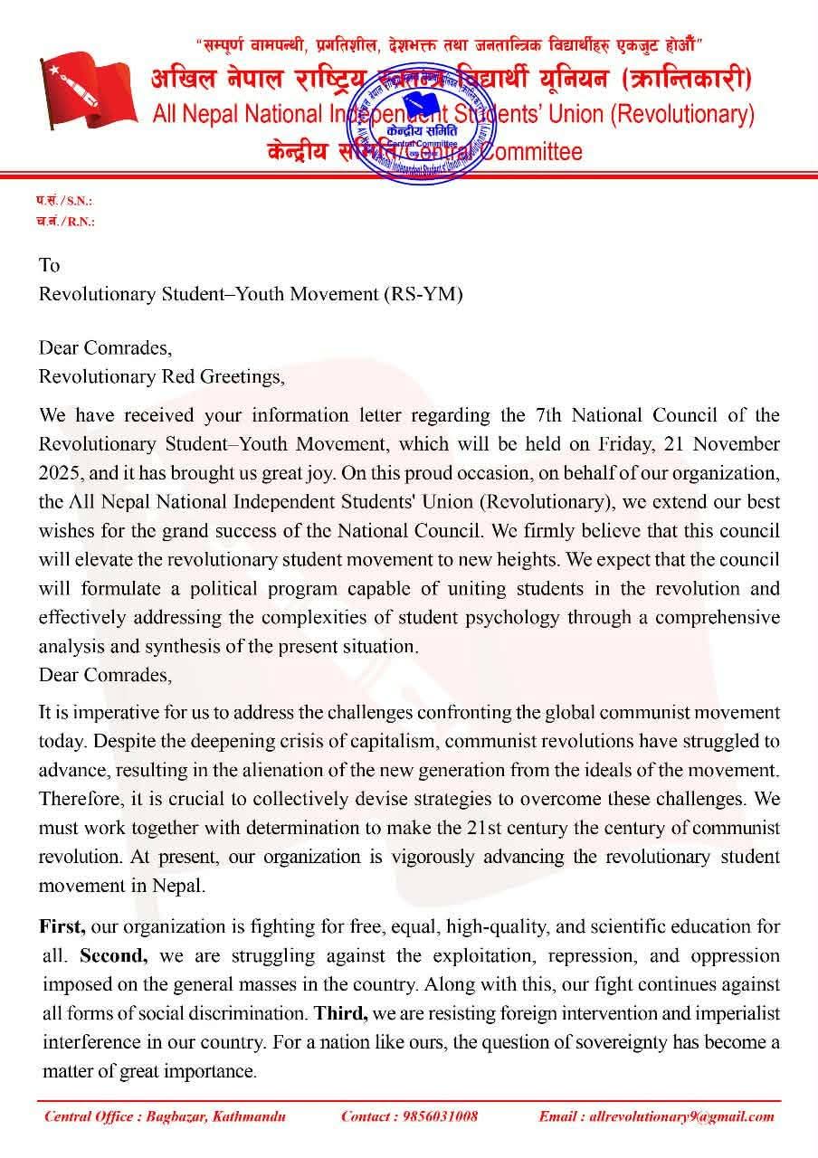 अखिल नेपाल राष्ट्रीय स्वतंत्र छात्र संघ (क्रांतिकारी) की केन्द्रीय समिति ने प्रेस विज्ञप्ति जारी करते हुए ‘सभी वामपंथी, प्रगतिशील, देशभक्त और लोकतांत्रिक छात्र, आइए एकजुट हों !’, का आह्वान किया है. 21 नवंबर 2025 को इसके अध्यक्ष बीरेंद्र शाह ने क्रांतिकारी छात्र-युवा आंदोलन (आरएस-वाईएम) के 7वीं राष्ट्रीय परिषद को ‘क्रांतिकारी लाल अभिवादन‘ करते हुए कहा है कि क्रांतिकारी छात्र-युवा आंदोलन की सातवीं राष्ट्रीय परिषद, जो शुक्रवार, 21 नवंबर 2025 को आयोजित होगी, के संबंध में आपका सूचना पत्र हमें प्राप्त हुआ है और इससे हमें अत्यंत प्रसन्नता हुई है.