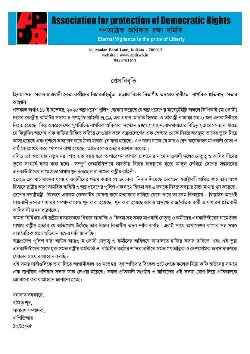 लोकतांत्रिक अधिकारों की सुरक्षा के लिए एसोसिएशन ‘डेमोक्रेटिक राइट्स डिफेंस सोसायटी’, जिसका पता 18, मदन बराल लेन, कोलकाता – 700012 है और वेबसाइट: www.apdrwb.in और फोन नं. 9433101611 है, का मानना है कि मानवाधिकार की सुरक्षा ही स्वतंत्रता का मूल्य है, ने आज (20 नवम्बर) को दोपहर 3 बजे से कॉलेज स्ट्रीट कॉफ़ी हाउस के सामने एक नागरिक विरोध सभा बुलाई गई है.
